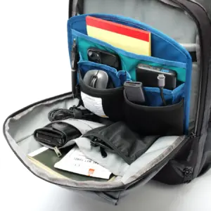 スマホ・モバイル充電器・眼鏡・電卓・マウス・手帳・ボルペン他小物などガジェットに細かく収納が出来ますので出し入れが楽になります。