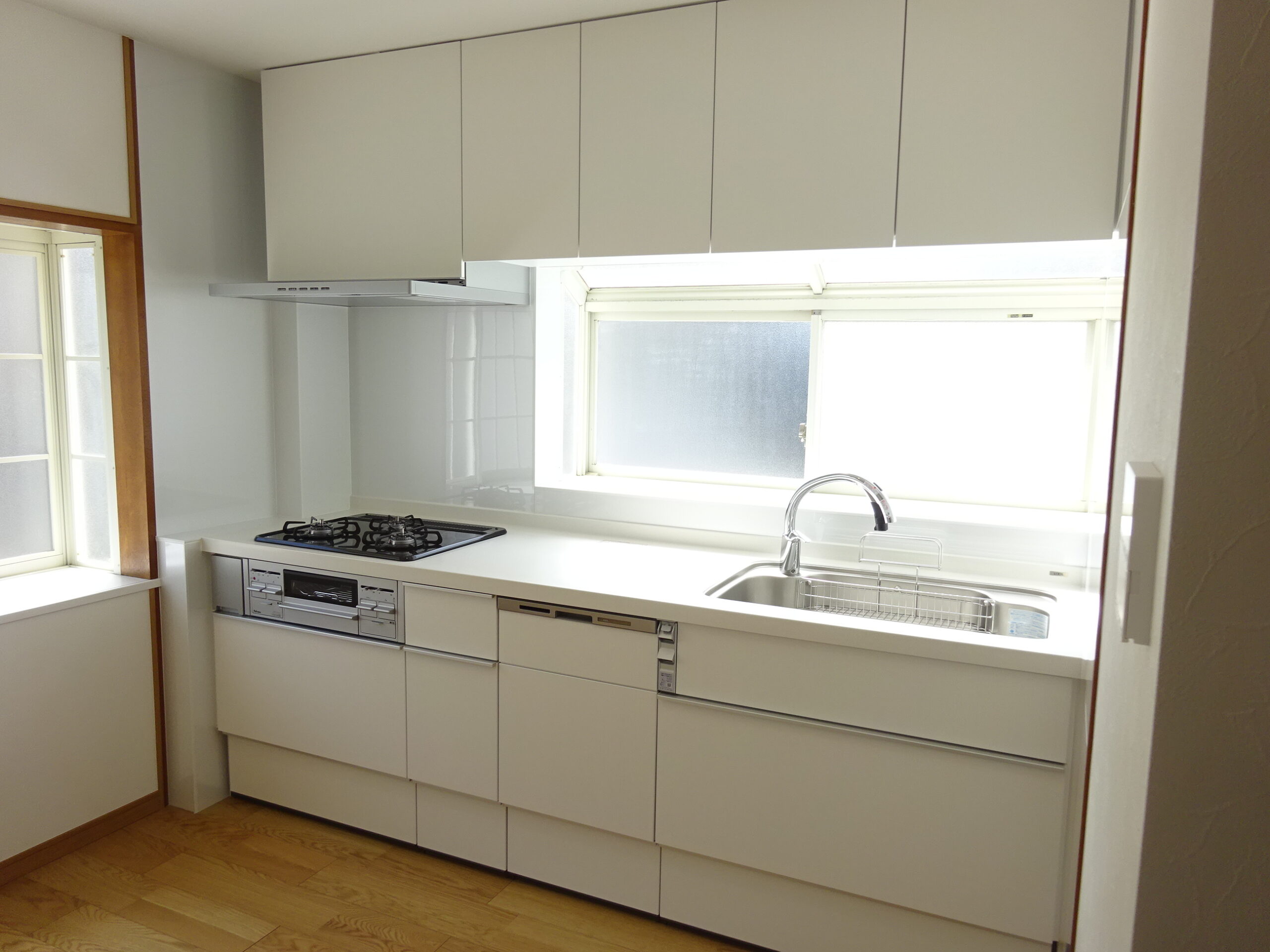キッチンガスコンロ前や出窓の四方枠はキッチンパネルでおさめました。